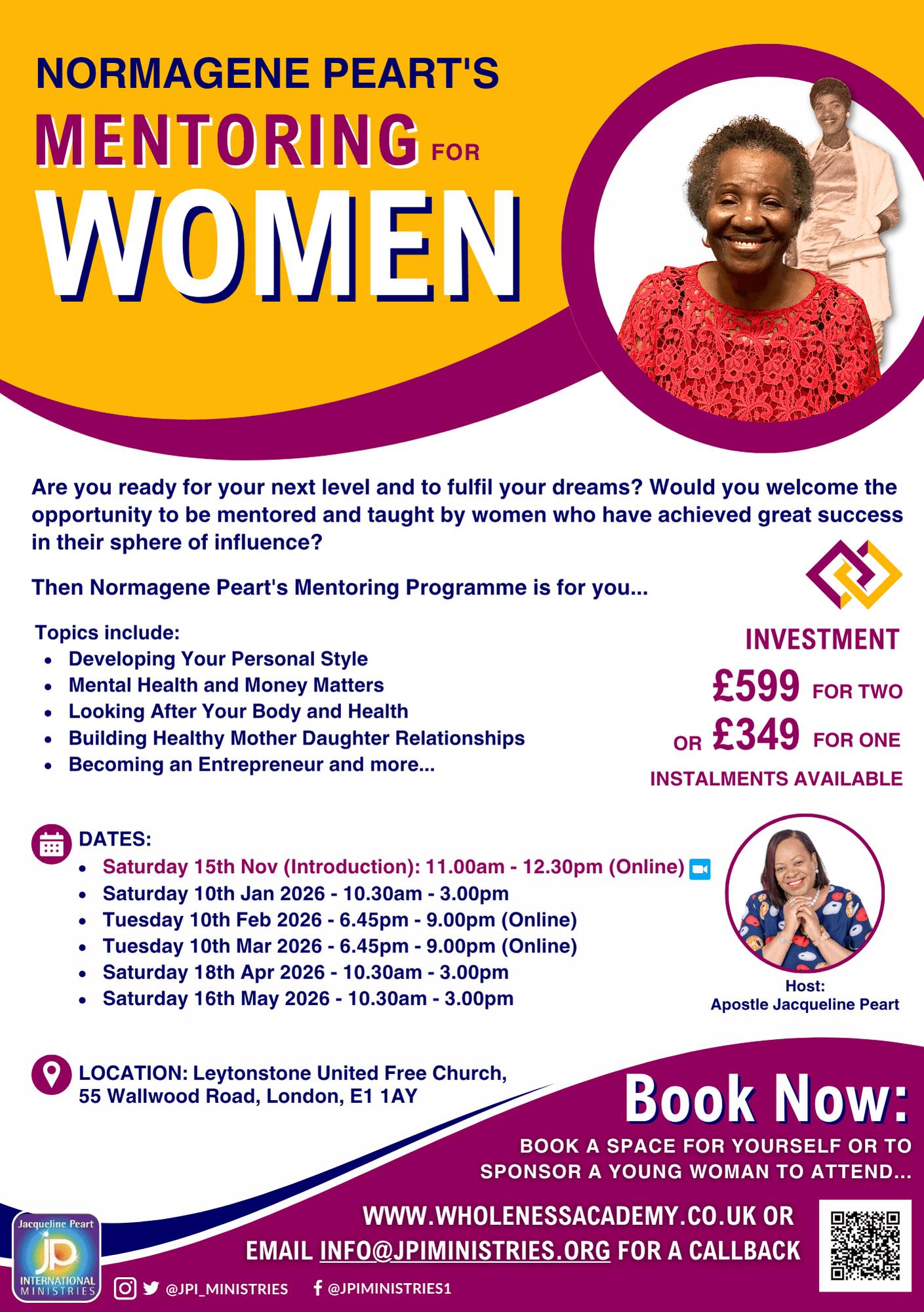 In Mummy Peart’s honour and part of her legacy, JPIM have gathered some incredible women of God, all of whom knew Mummy Peart and will share from their specialism to mentor the next generation of mothers and Kingdom Builders.