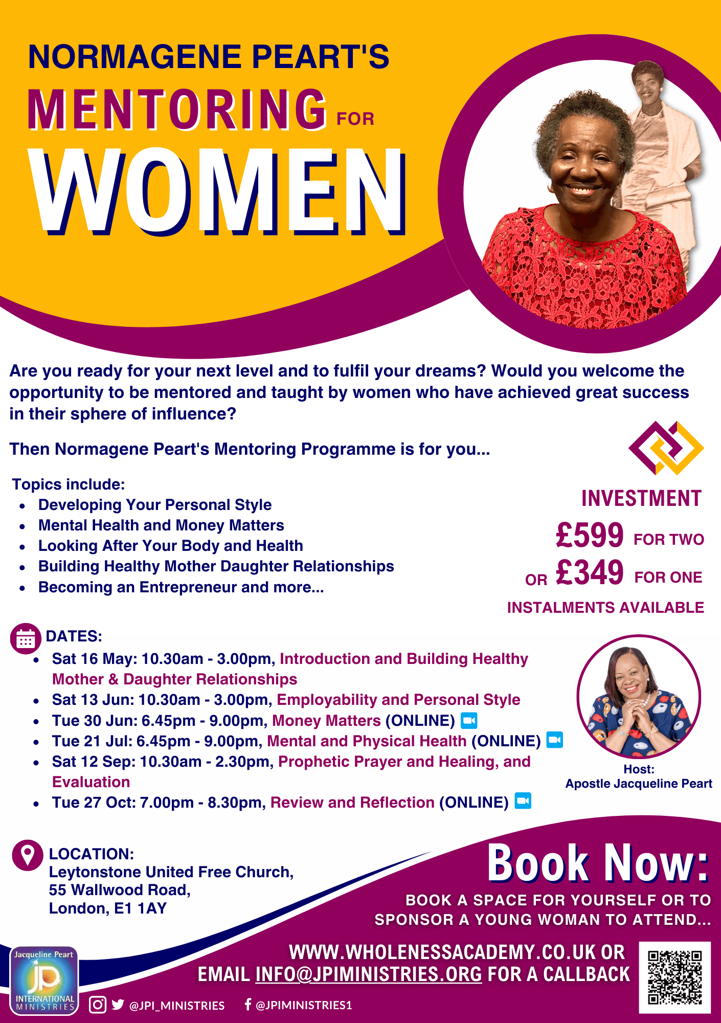 In Mummy Peart’s honour and part of her legacy, JPIM have gathered some incredible women of God, all of whom knew Mummy Peart and will share from their specialism to mentor the next generation of mothers and Kingdom Builders.